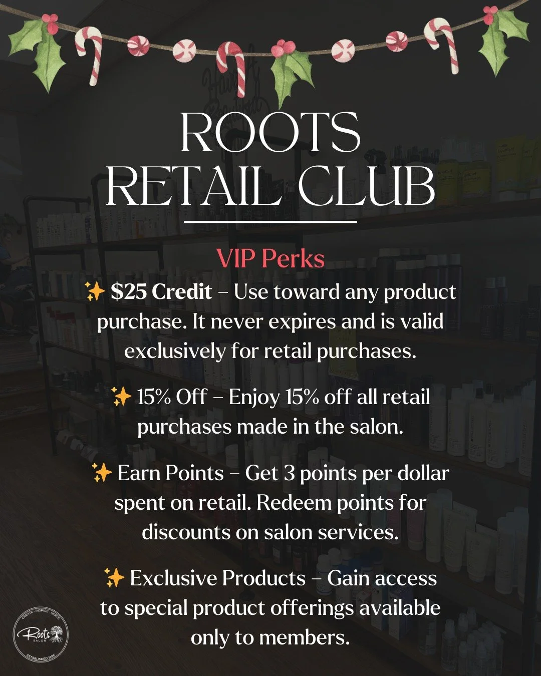 ✨ Earn Points – Get 3 points per dollar spent on retail. Redeem points for discounts on salon services.